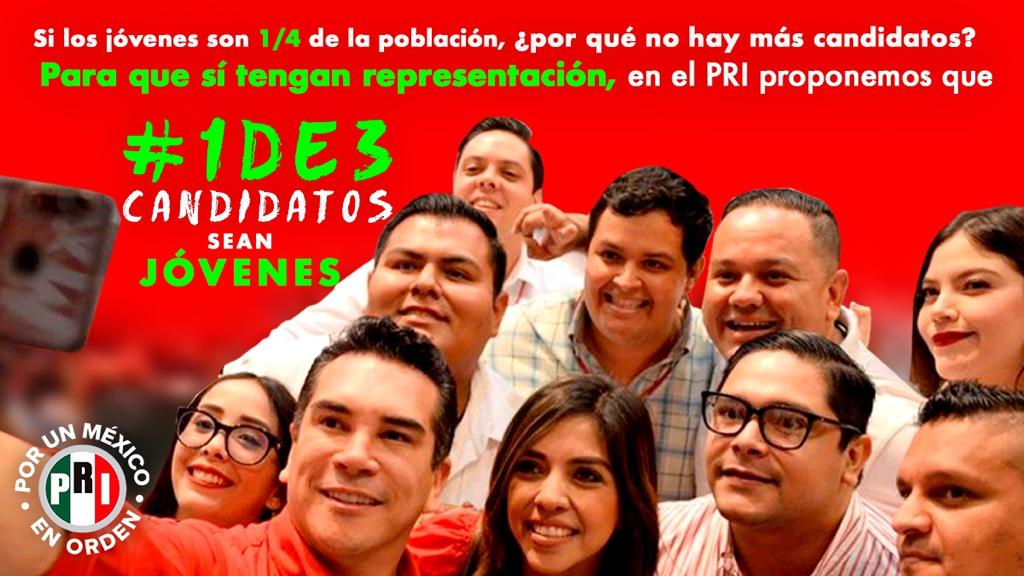 Para lograr un verdadero desarrollo y construir un futuro mejor, el tricolor considera indispensable la participación de este sector en la política, desde donde puedan formar parte en la toma de decisiones en todos los niveles de gobierno. Por ello, presenta la iniciativa 1 de 3, para que la juventud forme una tercera parte de los candidatos a los cargos de elección popular a nivel nacional.